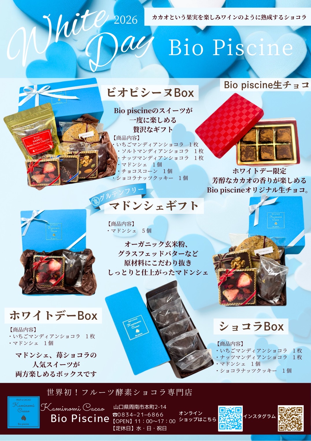 News ホワイトデー商品のご案内 NEW 3月の定休日のお知らせ NEW 2月の定休日のお知らせ 1月の定休日のお知らせ 年末年始のご案内 過去のお知らせ 原田屋BLOG 2025年11月30日 年末年始の営業について お知らせしおんチョコレートブログ原田屋樹木葬海洋散骨 平素は格別のお引き立てを賜り、厚く御礼申... 過去のBLOGを読む